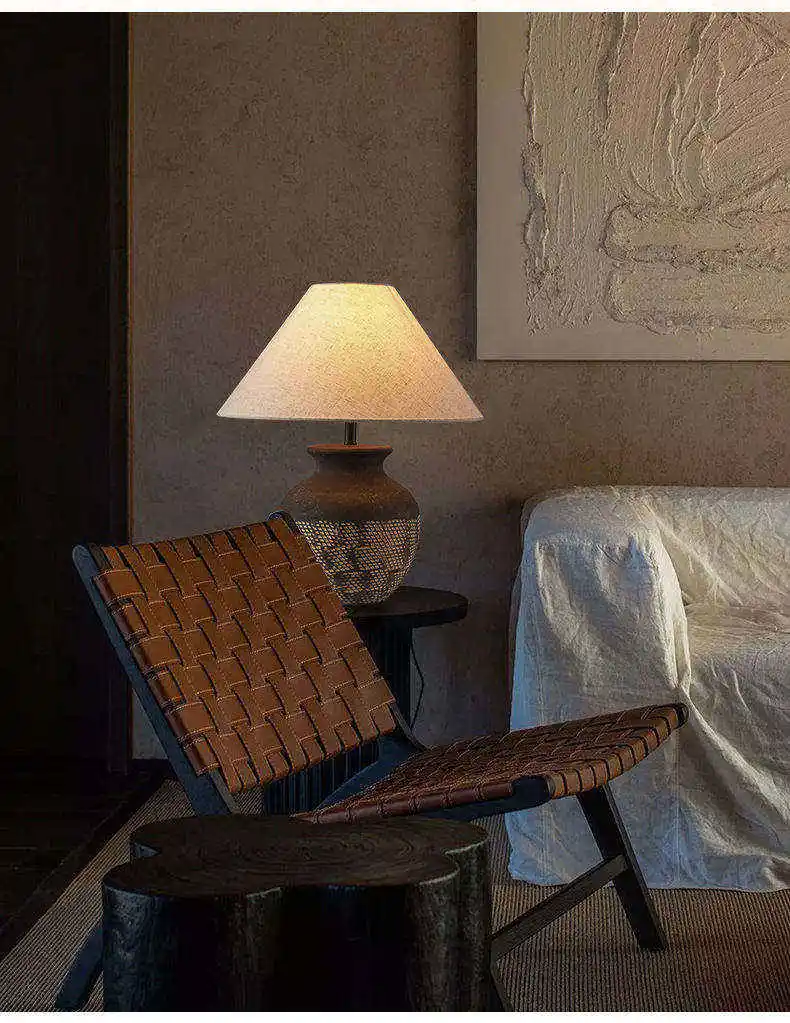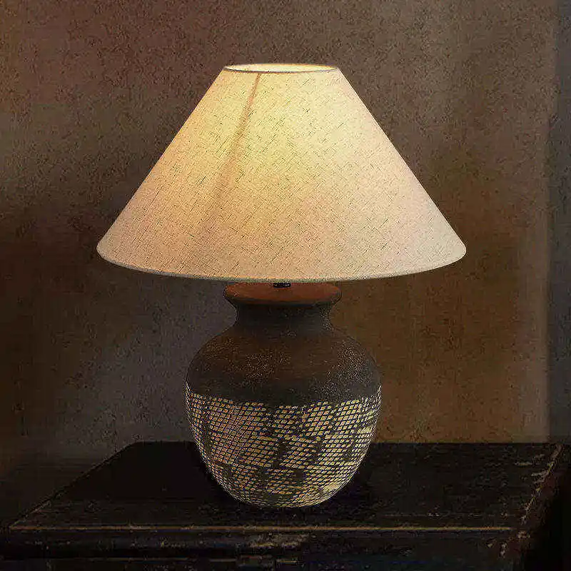 Japanese Style Home Decorative Handmade Ceramic Desk Lamp with Fabric Lampshade Retro Table Lamp for Hotel Living Room